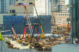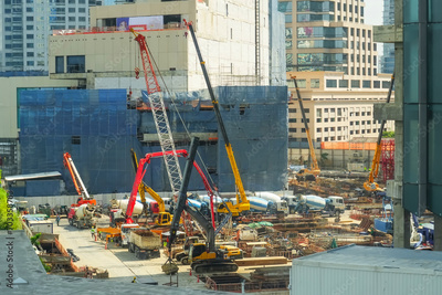 Large scale construction site overlook with a lot of construction equipment cranes, trucks, pumps, piles