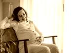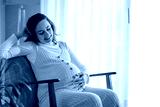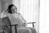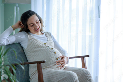 Happy pregnant young woman touching her pregnant belly and sitting near the window