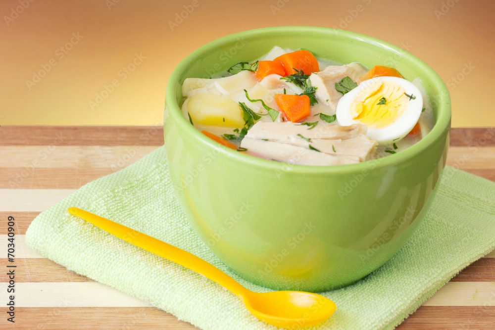 Chicken soup bowl with spoon closeup on wooden.