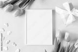 Flowers composition romantic. Flowers pink tulips, photo frame on pastel pink background. Wedding. Birthday. Happy woman's day. Mothers Day. Valentine's Day. Flat lay, top view, copy space