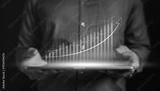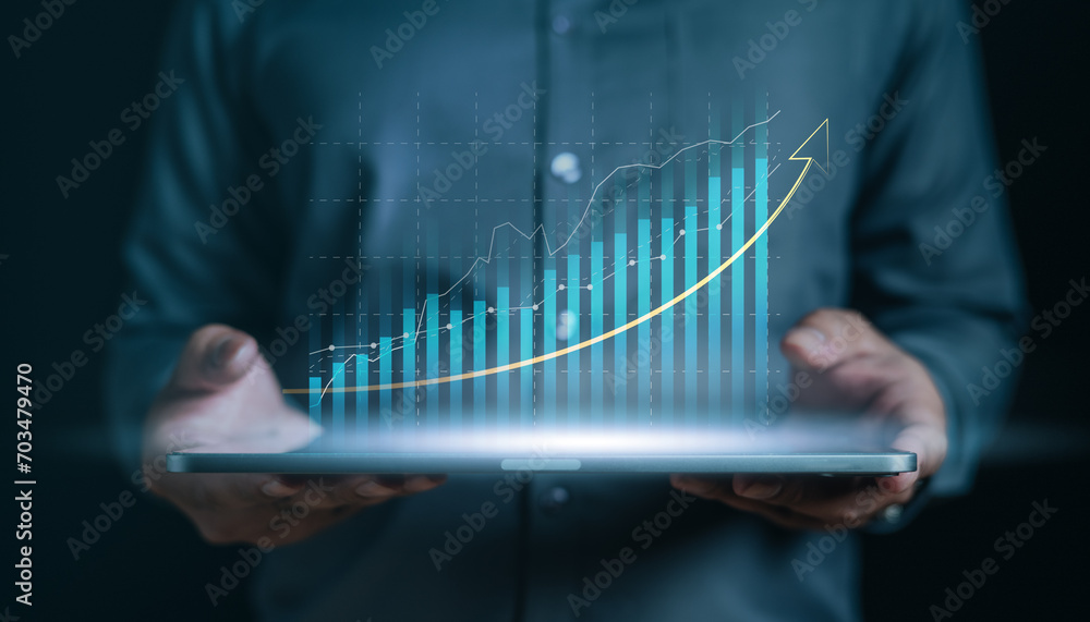 business, chart, graph, growth, success, analysis, diagram, digital, finance, investment. close up to hand of businessman, hold the bar chart from finance investment on tablet, direct variation graph.