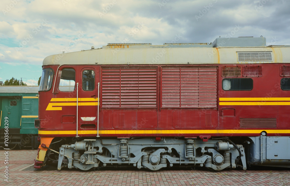 Cabin of modern Russian electric train. Side view of the head of railway train with a lot of wheels and windows in the form of portholes