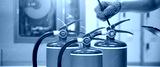 Fire extinguisher has hand engineer checking pressure gauges with exit door to prepare fire equipment for protection in emergency case and safety or rescue and alarm system training concept.