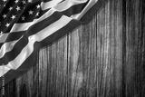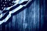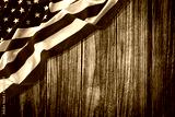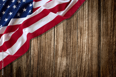 Top view overhead America United States flag, memorial remembrance and thank you of hero, studio shot with copy space on wooden table background, USA holiday Veterans or Independence day concept.