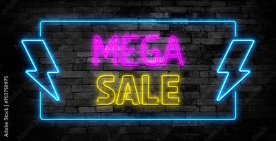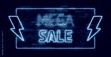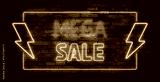 Mega Sale neon sign on brick wall background. Template for discount.