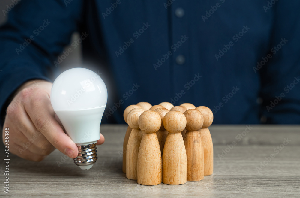 Recruit people with an idea and ideology. Leader accumulates ideas and experience to make a solution. Research and development. Teamwork. Brainstorming. Creativity. Education and knowledge.