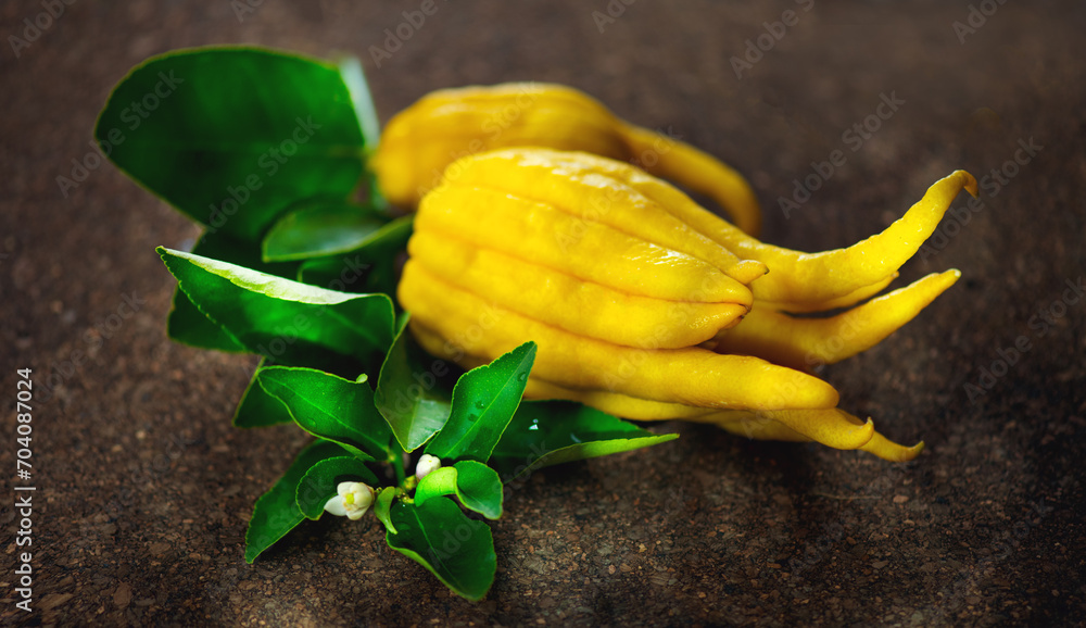 Buddha hand citrus fruit. Yellow Organic fingered citron, Buddha's Hand Citrus Fruit with Fingers, flowers and leaves of plant. Aromatherapy concept.