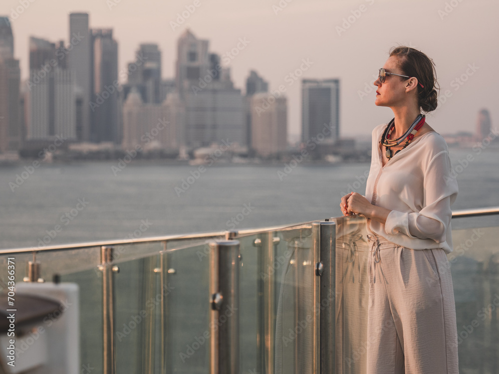 Cute woman standing on the empty deck of a cruise liner against the background of the city of Doha. Sunny morning, clear day. Closeup, outdoor. Vacation and travel concept