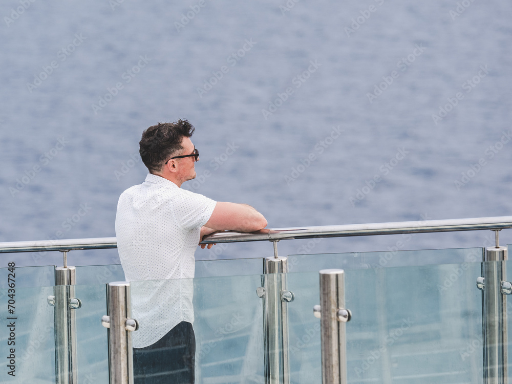 Handsome man standing on the empty deck of a cruise liner against the backdrop of sea waves. Sunny, clear day. Closeup, outdoor. Vacation and travel concept