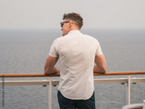 Handsome man standing on the empty deck of a cruise liner against the backdrop of sea waves. Sunny, clear day. Closeup, outdoor. Vacation and travel concept