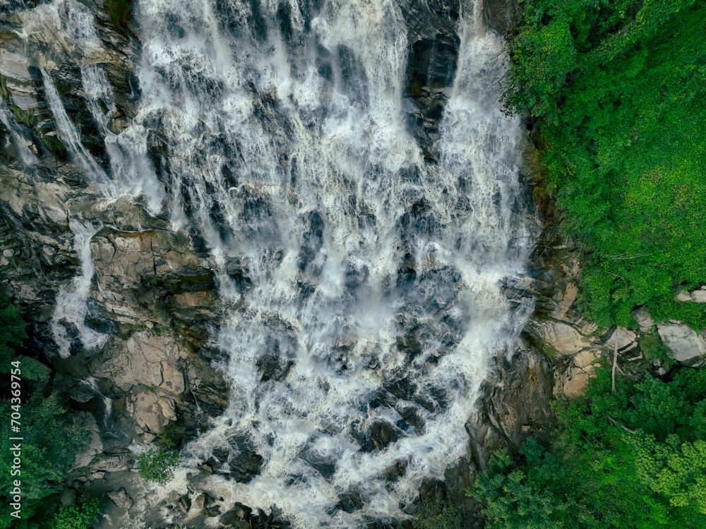 Aerial view waterfall in lush tropical green forest. Nature landscape. Mae Ya Waterfall is situated in Doi Inthanon National Park, Chiang Mai, Thailand. Waterfall flows through jungle on mountainside.