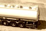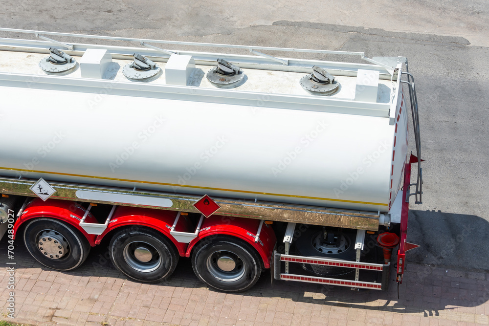 Heavy transportation industry. Moving liquid shipment. Tank trailer semi truck on a parking, aerial view.