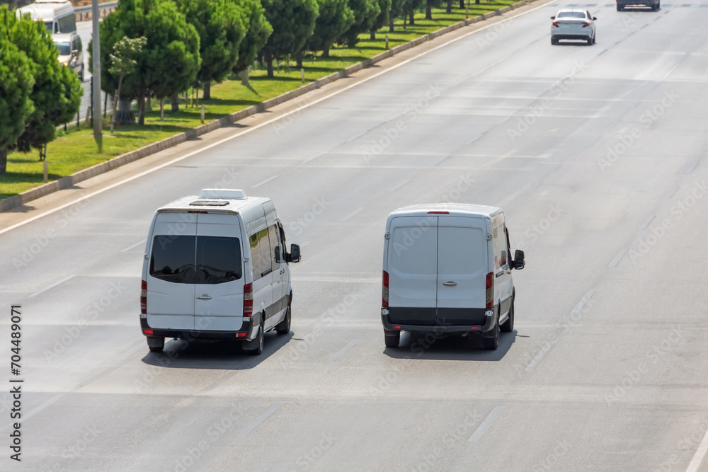 White modern delivery small shipment cargo courier van moving fast on motorway road to city urban suburb. Business distribution and logistics express service. Aerial top view