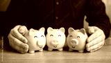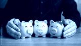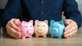 A man puts together piggy banks. Create your investment portfolio. Manage assets. Bank deposits and savings. Diversification of investments. Store and accumulate funds.