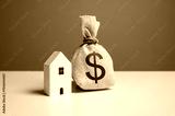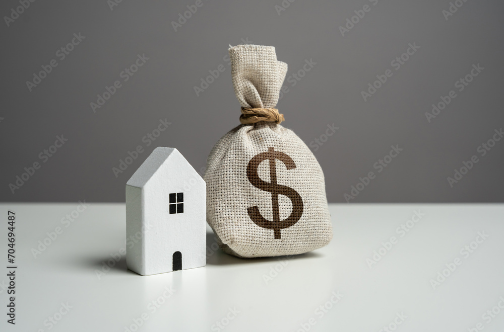 House and dollar money bag. Property value appraisal. Make a deal. Property Insurance. Taxes. Buying and selling real estate. Housing prices.