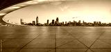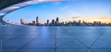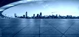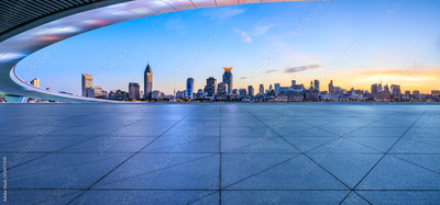 Empty square floor and bridge with city skyline at sunset in Shanghai. Panoramic view.