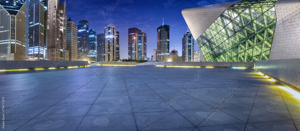 City square floor and modern commercial building scenery at night in Shanghai. Famous financial district buildings in Shanghai. Panoramic view.