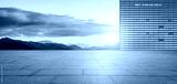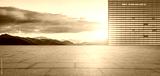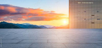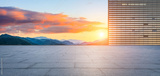 Empty square floor and glass wall with mountain nature landscape at sunset. panoramic view.
