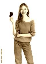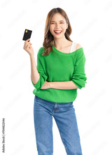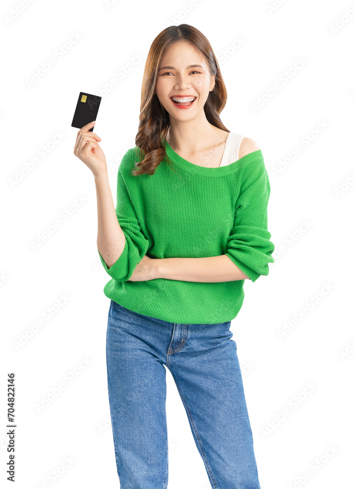 Cheerful young asian woman in green shirt with holding bank card isolated on white background.