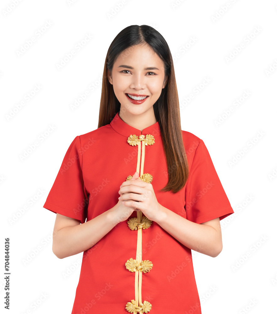 Beautiful Asian woman wearing traditional cheongsam dress and standing and gesture of congratulation on white background.