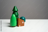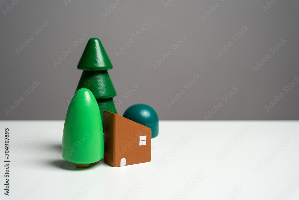 Forest house surrounded by trees, toy figures. Remote settlements. Active recreation and tourism. Environmental friendliness and unity with nature. Harmony with nature. Self-contained housing.