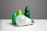 Energy saving light bulb surrounded by forest trees. Harmonious blend of sustainability and nature, showcasing the positive impact of energy-efficient choices on the environment.
