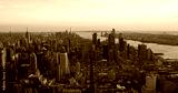 New York City Aerial Evening Cityscape with Stunning Manhattan Landmarks, Skyscrapers and Residential Buildings. Long Wide Angle Panoramic Helicopter View of a Popular Travel Destination