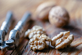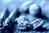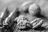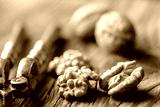 Walnut nut kernels with a vintage silver nut cracker close up. Food photography