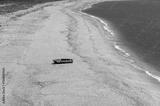 Top view of the sandy seashore. Lonely boat on a sandy beach