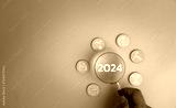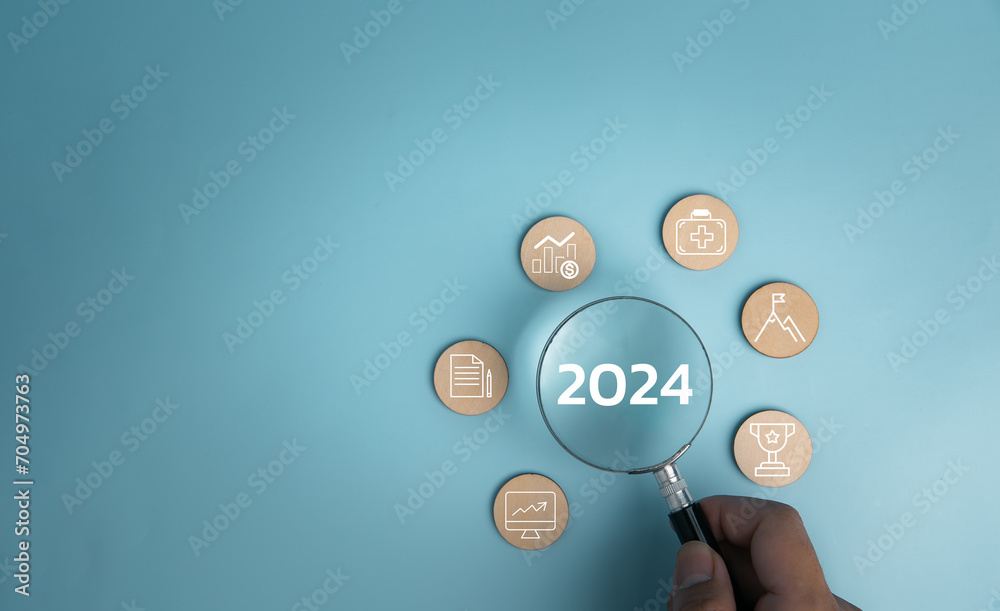 hand hold magnifier vision new year 2024 on background. Concept strategy target plan and goal finance investment and management
