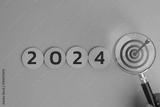 hand hold magnifier vision new year 2024 on background. Concept strategy target plan and goal finance investment and management