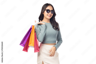 Portrait excited beautiful woman wearing sunglasses hold shopping bags isolated on white background and copy space Surprise happy asian lady open mouth with excited Beauty young female love shopping
