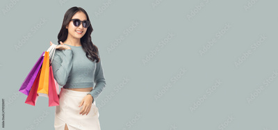 Portrait excited beautiful woman wearing sunglasses hold shopping bags isolated on white background and copy space Surprise happy asian lady open mouth with excited Beauty young female love shopping