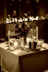 holidays, romantic date and celebration concept - close up of festive table serving for two with gift box, flowers in vase and candles burning at home on valentine's day