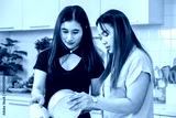 Asian professional female bakery pastry chef housewife holding egg whisk beater machine mixing whisking while friend pouring eggs in glass bowl preparing making flour dough in full decorated kitchen