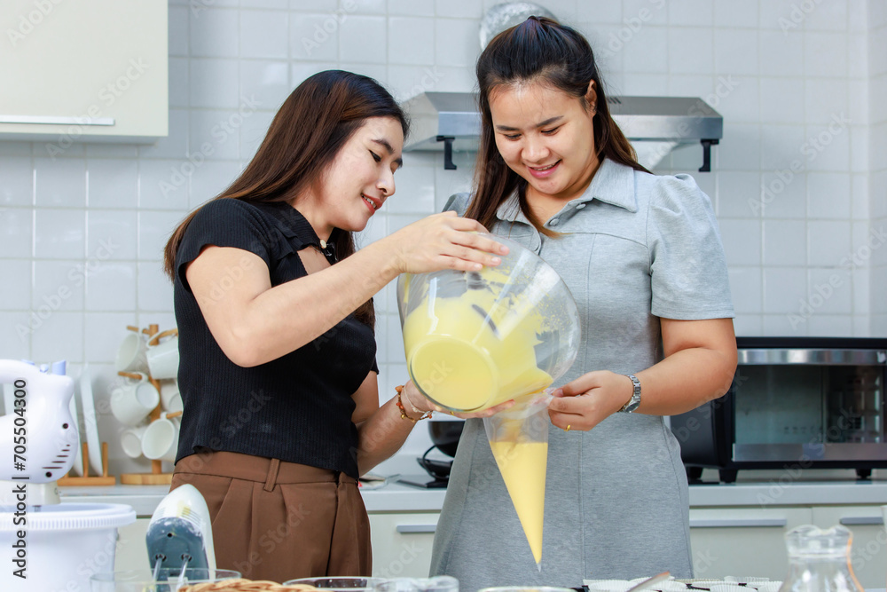 Asian professional female bakery pastry chef housewife holding glass bowl pouring mixing eggs flour whipped cream into plastic tube bag preparing squeezing topping cupcakes in full decorated kitchen