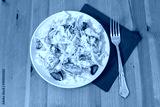 Fresh healthy caesar salad with chicken breast, lettuce, parmesan cheese, dressing and croutons on wooden table. Top view