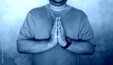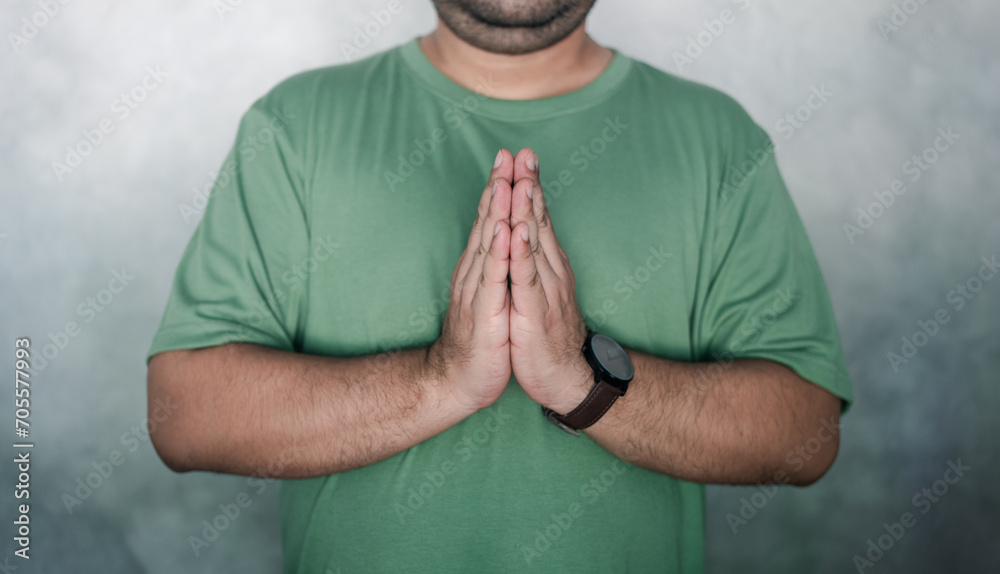 Portrait Asian young man pay respect, sawasdee symbol from Thailand greeting culture for hello or goodbye. Hand symbol means to pay respect and greeting others.