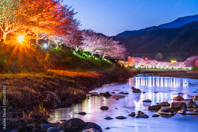 河津町の夜景 河津川沿いのライトアップされた美しい河津桜【静岡県】