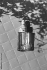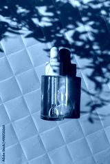 Serum glass bottle on the water texture on blue paper checkered texture background on the noon sunlight with leaves shadow.