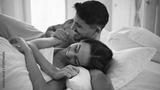 Laughing newlyweds having fun bed close up. Smiling man kissing shoulder of lady