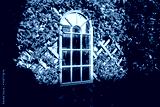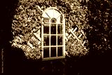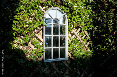Ornate garden mirror giving the illusion of a arched window seen against strong winter sun on a wall of grape vines.