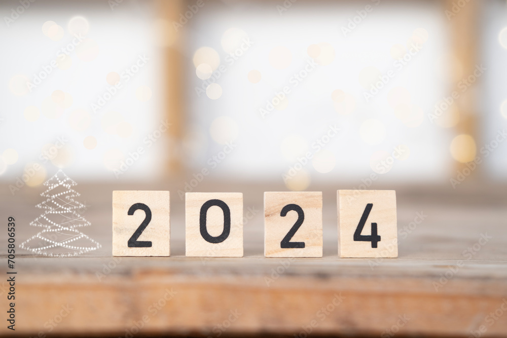 Wooden letters spelling date 2024 on vintage wooden table, Time Management and Planning, office aesthetics and business settings