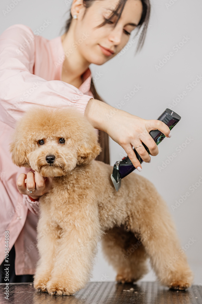 Groomer grooms little cute poodle puppy with trimmer. A woman doing her hair at a pet hairdresser in a grooming salon. Beautiful little puppy in a grooming salon or veterinary clinic.