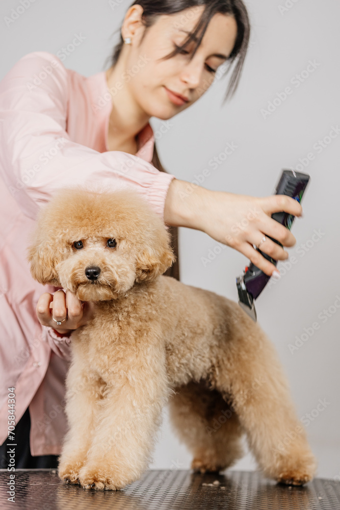 Groomer grooms little cute poodle puppy with trimmer. A woman doing her hair at a pet hairdresser in a grooming salon. Beautiful little puppy in a grooming salon or veterinary clinic.
