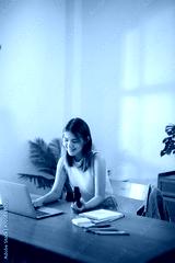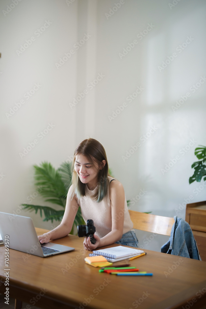 Creative designer woman using laptop to checking photo and working graphic design in home studio