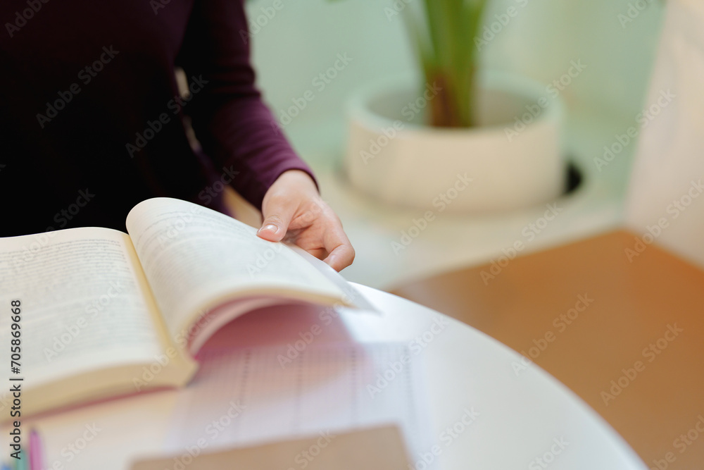 Self learning concept. Young woman student university Researching Book In Library. University Student
