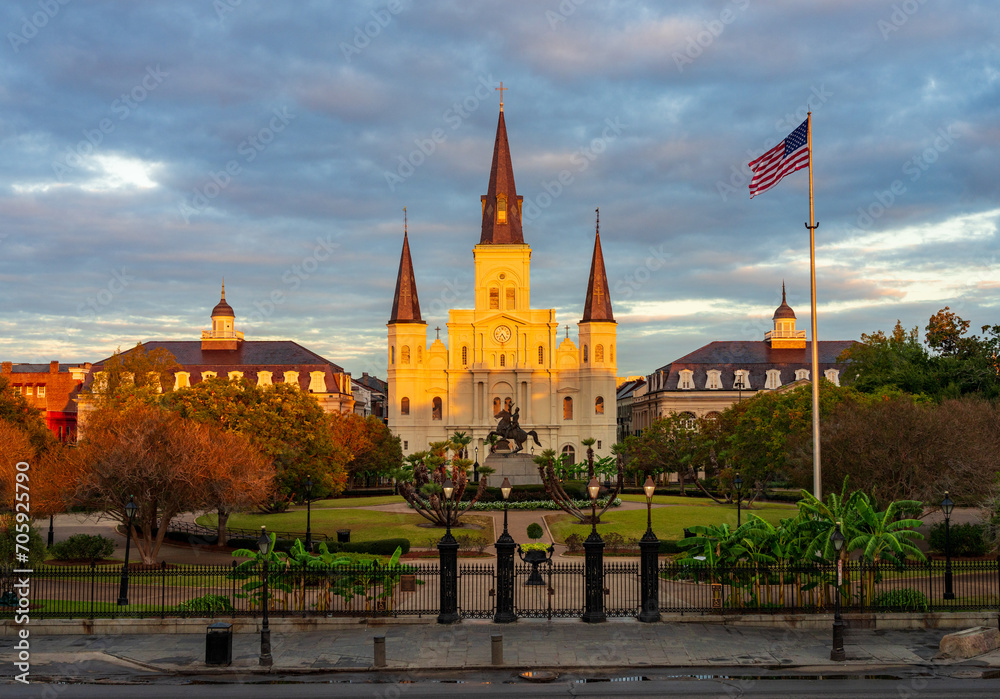 Rays from rising sun hit the facade of the Cathedral of St Louis, King of France with statue of Andrew Jackson in New Orleans in Louisiana
