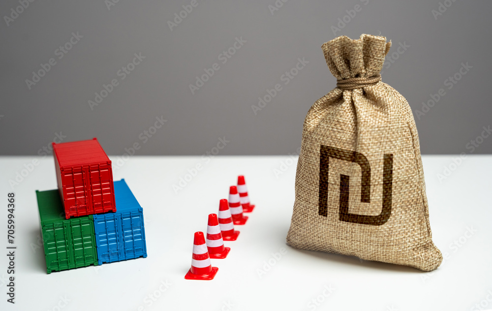 Shipping containers with goods and Israeli shekel money bag are separated by a barrier. Break a trade deal. Economic sanctions. Difficulties in maritime trade. Naval blockade. Logistics difficulties