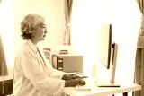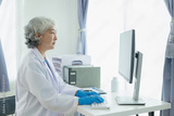 science pictures Computer and senior woman typing health care innovation report Laboratory research or medical analysis and hospital development